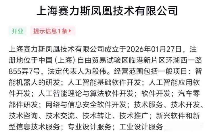近日,赛力斯新增了一则工商信息:上海赛力斯凤凰技术有限公司正式成立,注册资本5000万人民币,由赛力斯集团全资持股。